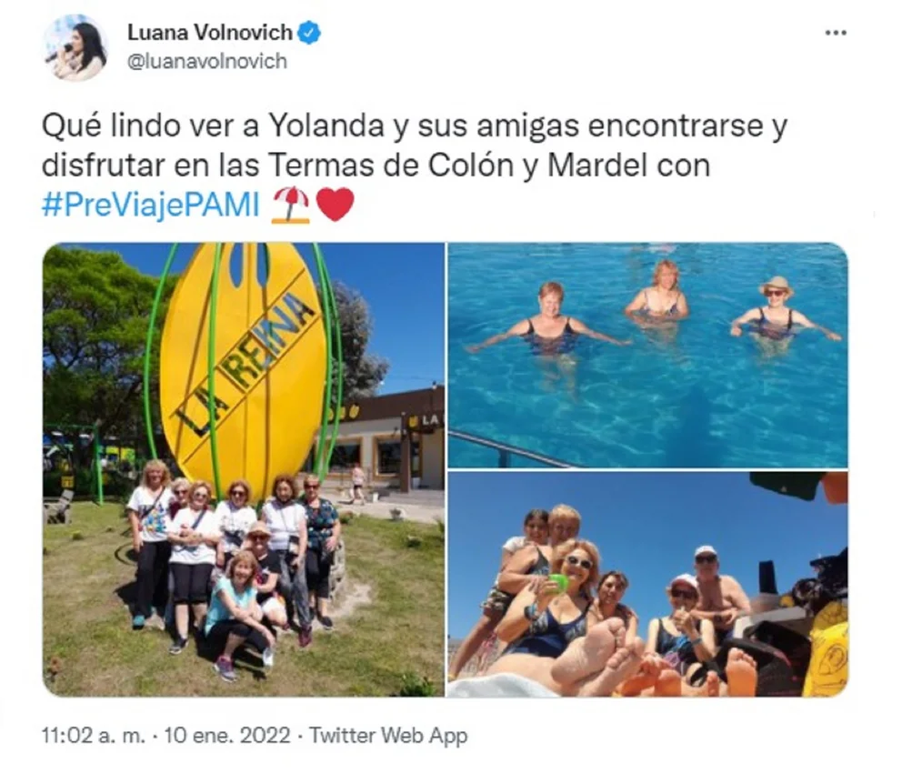 “Qué lindo ver a Yolanda y sus amigas encontrarse y disfrutar en las Termas de Colón y Mardel con #PreViajePAMI”, decía el mensaje publicado el 10 de enero junto a una serie de fotos de un grupo de mujeres mayores en la ciudad balnearia.