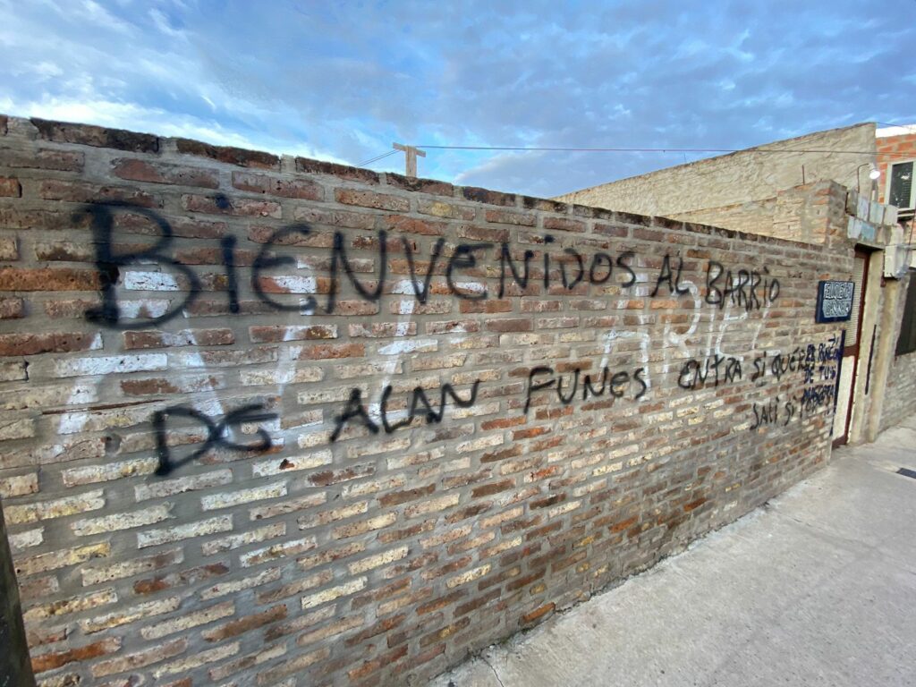 En la vereda de enfrente al pasillo que fue escena anoche del homicidio, un paredón tiene pintada la leyenda: “Bienvenidos al barrio de Alan Funes: entrás si querés, salís si podés”. Se trata de un joven líder narco, que cumple condena de 50 años en una cárcel federal.