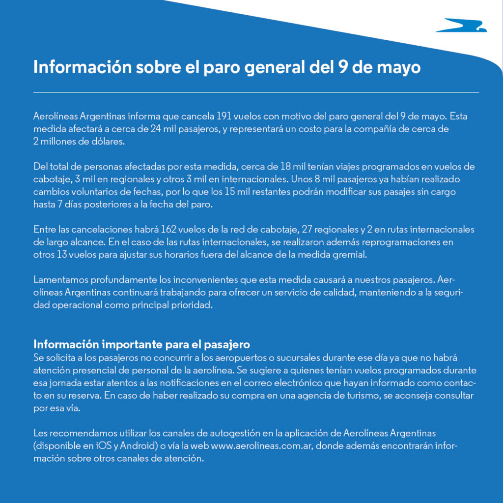 “Se solicita a los pasajeros no concurrir a los aeropuertos o sucursales durante ese día, ya que no habrá atención presencial de personal de la aerolínea. Se sugiere a quienes tenían vuelos programados durante esa jornada estar atentos a las notificaciones en el correo electrónico que hayan informado como contacto en su reserva”, explicaron en el comunicado.
