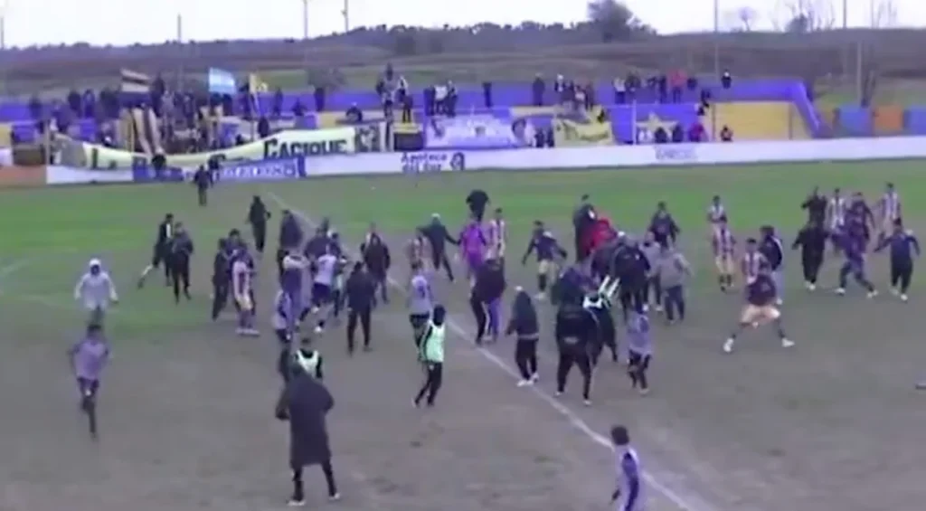 En un confuso episodio, varios hinchas del equipo rival ingresaron al campo de juego y comenzaron a agredir a los jugadores que se encontraban en el banco de suplentes.