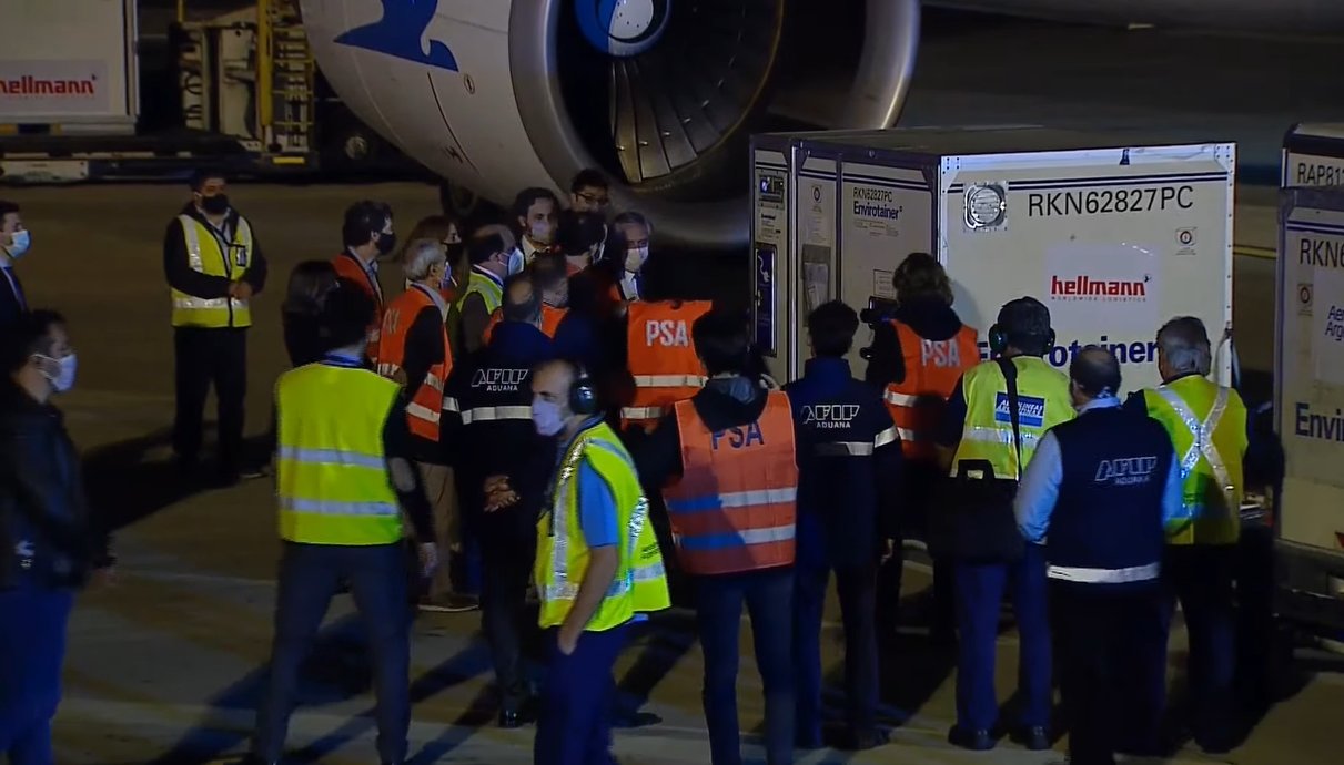 En medio de la expectativa generada por los anuncios, Alberto Fernández recibió el vuelo de Aerolíneas Argentinas que cargó un millón de vacunas Sinopharm desde China. Es el último de los cuatro envíos que arribarán al Ezeiza esta semana provenientes de Beijín.