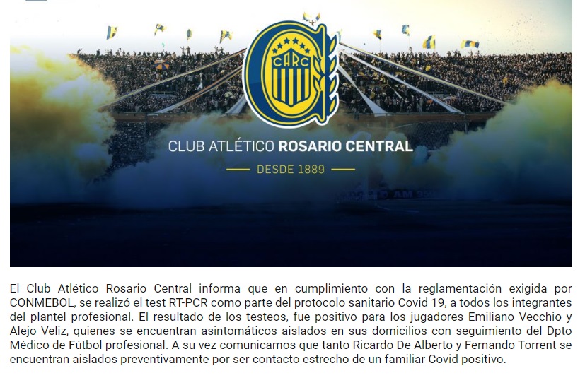 Tras el clásico que movilizó a toda la ciudad durante el fin de semana, Rosario Central informó casos de Coronavirus en el plantel. Se trata de Emiliano Vecchio, quien presentó síntomas durante esta tarde.