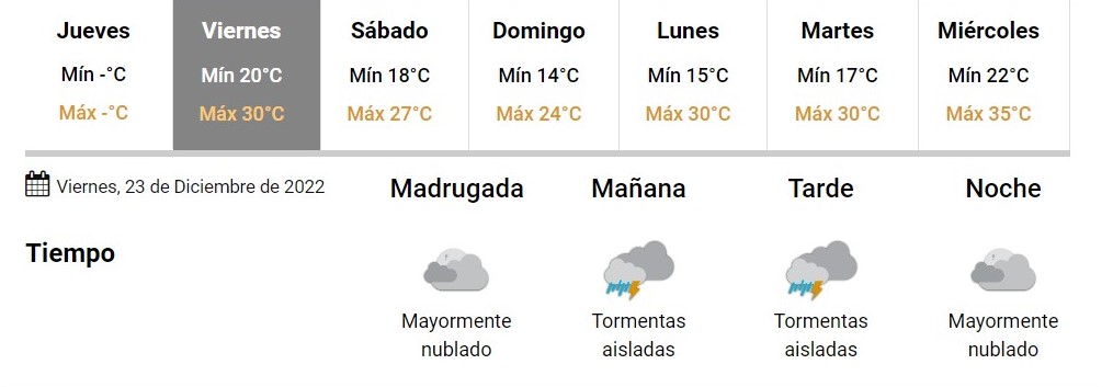 Para este viernes se espera una máxima de 30° y una mínima de 20°, con posibilidad de tormentas aisladas durante la mañana y la tarde. Por su parte, el fin de semana de Navidad se perfila con agradable clima.