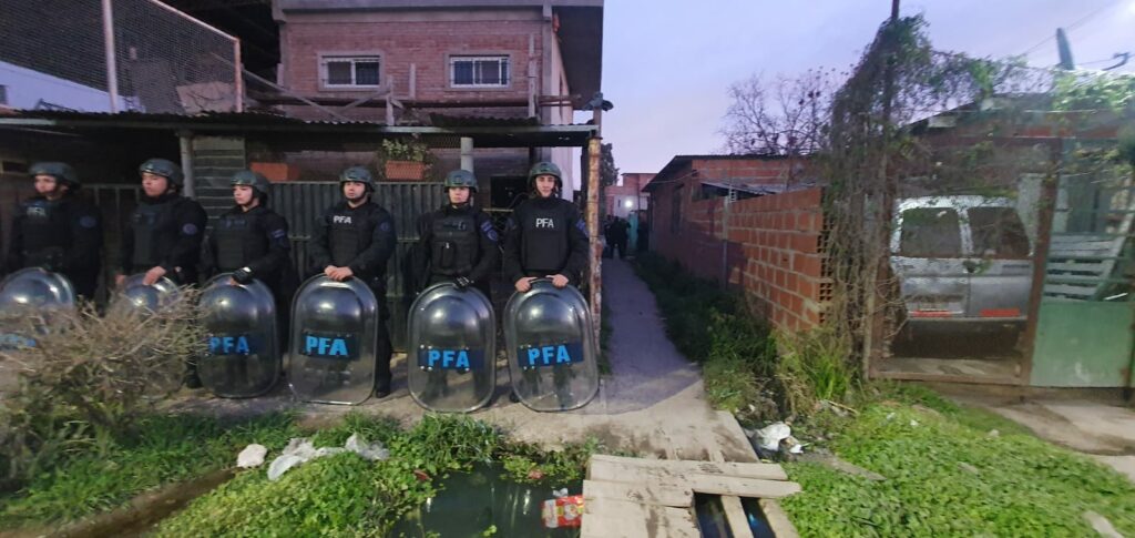 En la madrugada del viernes, tropas de la Policía Federal irrumpieron en diez domicilios de Empalme Graneros, vinculados a una banda narco que actuaba en la zona noroeste de Rosario. Se lograron hubo siete detenciones, se encontraron armas, droga, celulares y documentación. La investigación estuvo a cargo de la Fiscalía Federal N°3, a cargo de Adriana Saccone y el operativo fue ordenado por el juez federal Carlos Vera Barros, que indagará a los detenidos en las próximas horas.