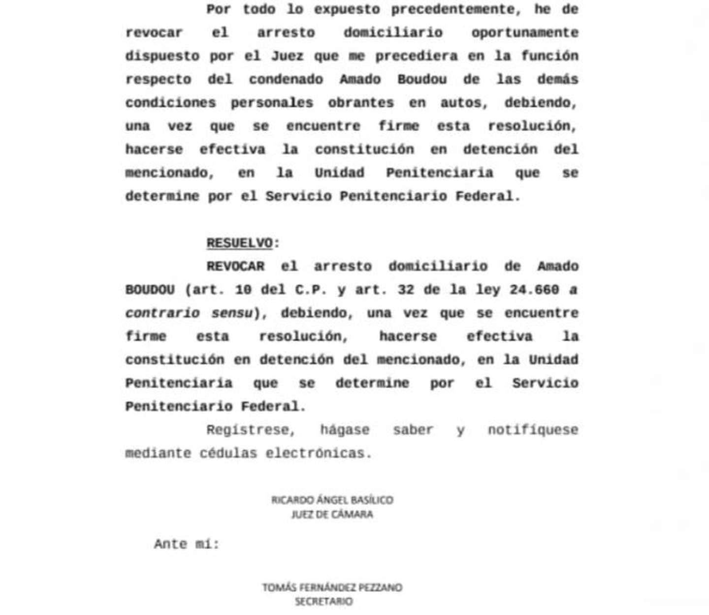 El juez Ricardo Basílico fue quien tomó la decisión. La defensa de Boudou apelará la decisión del juez, la causa pasará a la Cámara de Casación Penal y ese tribunal será el encargado de definir si la sanción se hará efectiva. La condena fue de cinco años y diez meses de cárcel en la causa que investiga la compra de la imprenta Ciccone Calcográfica.