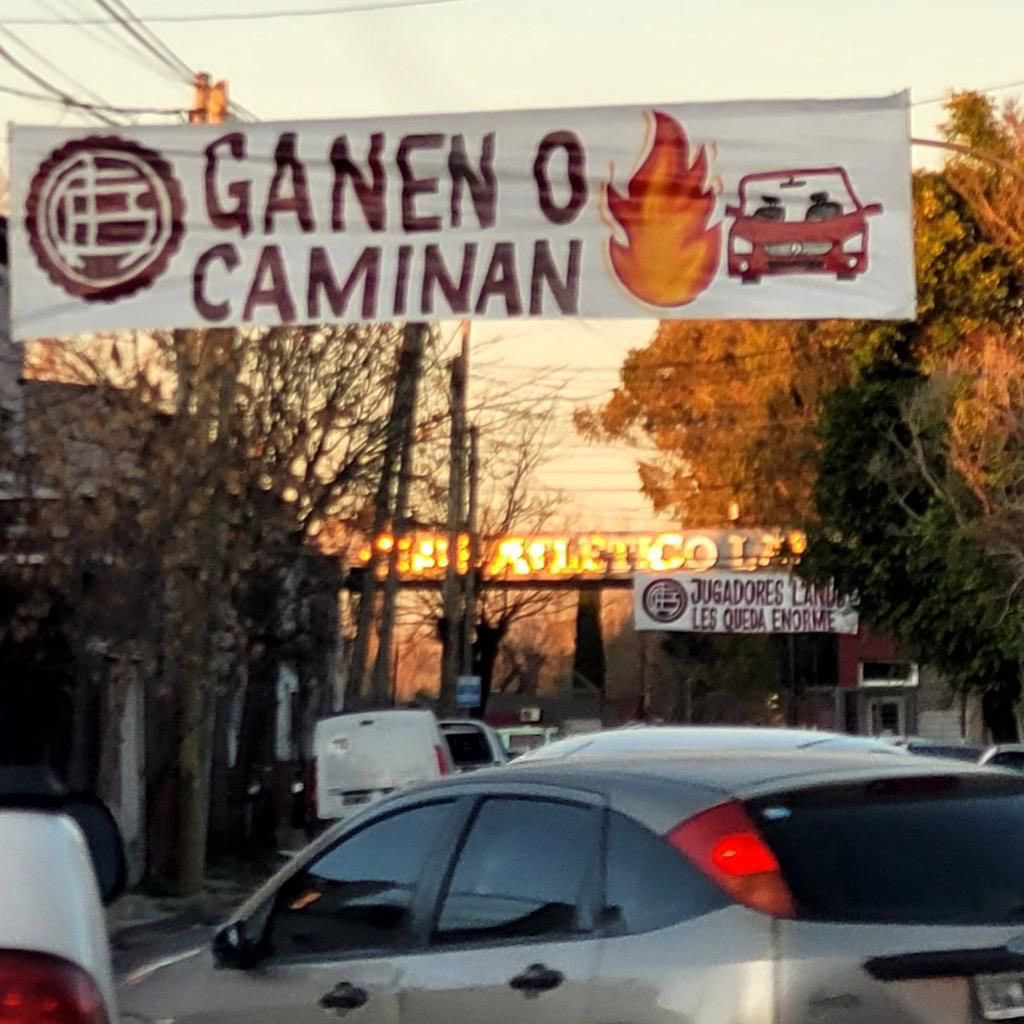 “Ganen o caminan” reza uno de los pasacalles que aparecieron en cercanías al estadio del Granate, que está acompañando la imagen de una llamarada y un auto, haciendo alusión a lo que ocurrió con los futbolistas de Aldosivi. “Jugadores, Lanús les queda enorme” comunica otro de los carteles ubicados en las cercanías de La Fortaleza.