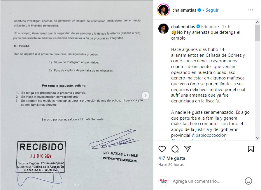 En los últimos días, Cañada de Gómez fue escenario de un importante operativo de seguridad que incluyó 14 allanamientos y culminó con la detención de varios delincuentes que operaban en la ciudad. A partir de los procedimientos, se registró una amenaza contra el intendente de la ciudad, Matías Chale, hecho que fue denunciado ante la fiscalía correspondiente.