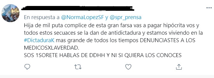 “Estoy recibiendo con un claro tinte fascista, agravios y amenazas en mis redes sociales hacia mi integridad física y la de mi familia. ‘Médicos por la Verdad’ es un movimiento negacionista que pone en riesgo la vida de la ciudadanía llamando incumplir las medidas sanitarias y eso es un delito. Son violentos: lo vimos ayer en el Monumento Nacional a la Bandera agrediendo a periodistas y policías. Nosotros respetamos la vida, la diversidad de pensamientos y los derechos”, afirmó López.