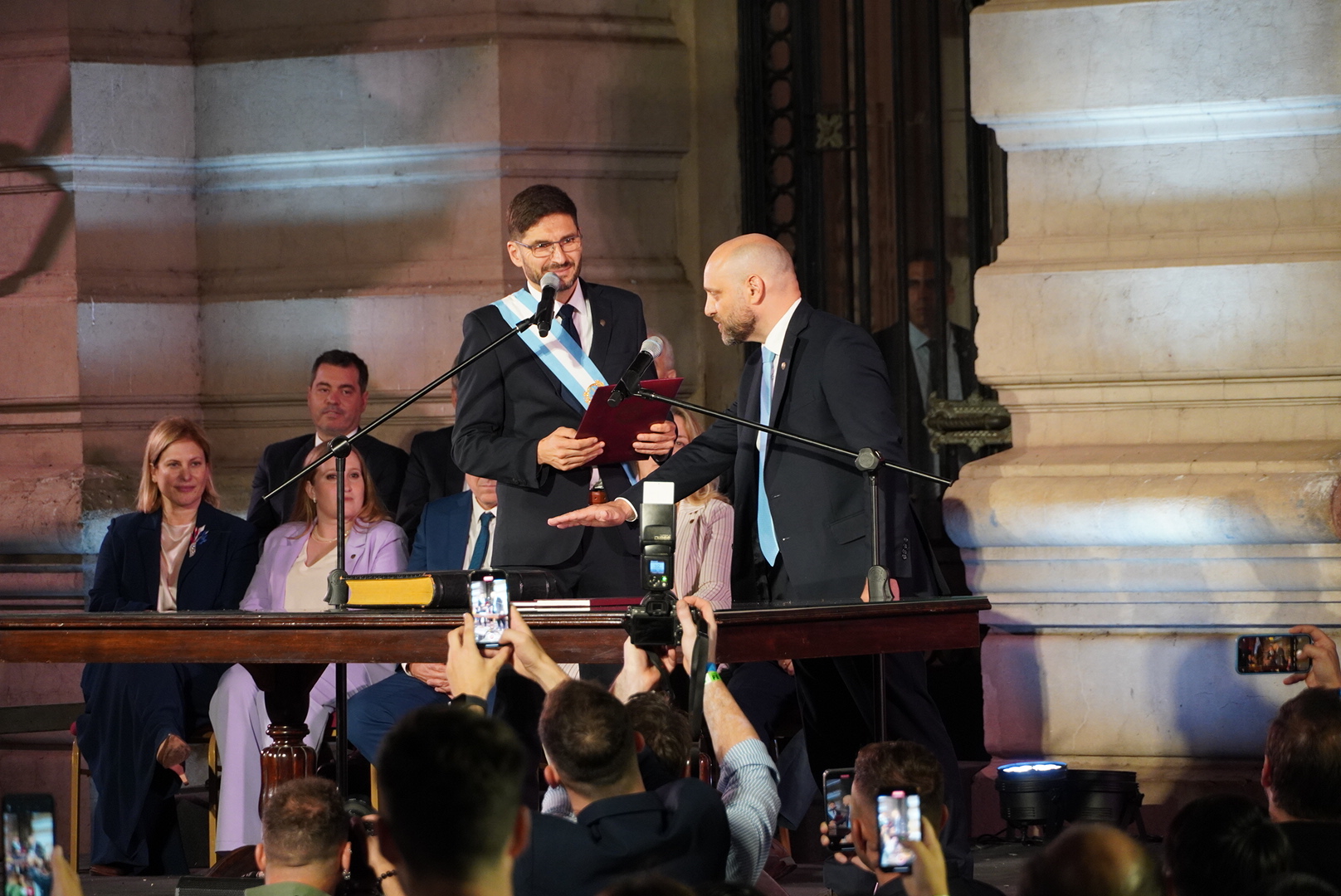 Luego del momento interreligioso, el gobernador recibió un mensaje de parte del Padre Ignacio, quien les deseo el éxito par su gestión. Posteriormente, el mandatario recibió el bastón de mando elaborado por el orfebre rosarino Dante Conti, y la bandera Argentina por los 40 años de democracia en mano de los legisladores Felipe Michlig y Carlos Fascendini.