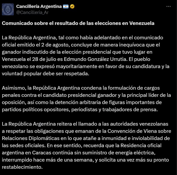“La República Argentina reitera el llamado a las autoridades venezolanas a respetar las obligaciones que emanan de la Convención de Viena sobre Relaciones Diplomáticas en lo que atañe a inmunidad e inviolabilidad de las sedes oficiales”, expresó el Ministerio de Relaciones Exteriores que conduce Diana Mondino.