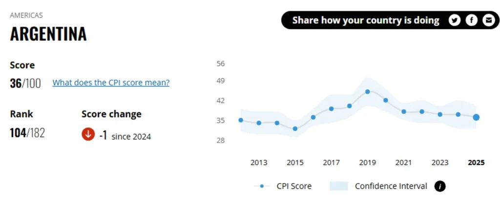 El dato surge del Índice de Percepción de la Corrupción (IPC) que elabora anualmente el movimiento global Transparencia Internacional, en el cual el país obtuvo una calificación de 36 puntos sobre 100 correspondiente al año 2025. Se trata de un punto menos que el registro de 2024, lo que refleja una percepción de mayor corrupción en el sector público argentino.