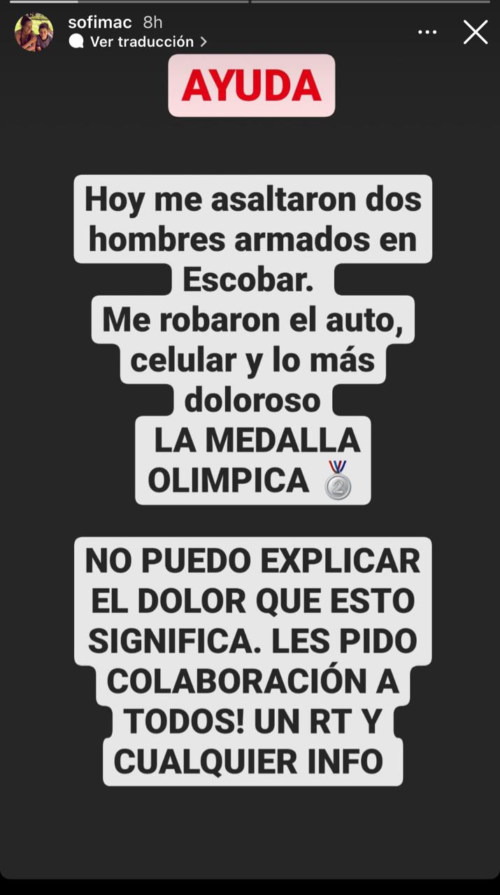 “Hoy me asaltaron dos hombres armados en Escobar. Me robaron el auto, celular y lo más doloroso LA MEDALLA OLÍMPICA. No puedo explicar el dolor que esto significa. Les pido colaboración a todos! Un RT y cualquier info”, pidió con desesperación en sus cuentas de Twitter e Instagram.