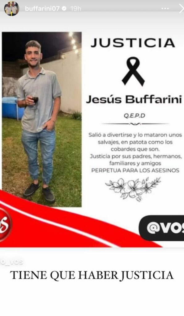 “Justicia para Jesús Buffarini. Salió a divertirse y lo mataron unos salvajes, en patota como los cobardes que son. Justicia por los padres, hermanos, familiares y amigos. Perpetua para los asesinos”, escribió el defensor del Rojo, a través de su cuenta de Instagram.