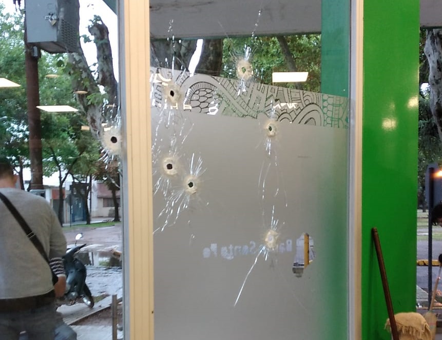 Por segundo día consecutivo una sucursal del Banco Santa Fe sufrió una balacera. Luego del ataque contra el establecimiento ubicado en la vecina ciudad de Villa Gobernador Gálvez, en las últimas horas el cajero de Granadero Baigorria recibió al menos nueve disparos contra su fachada. Los delincuentes también dejaron una carta amenazante.