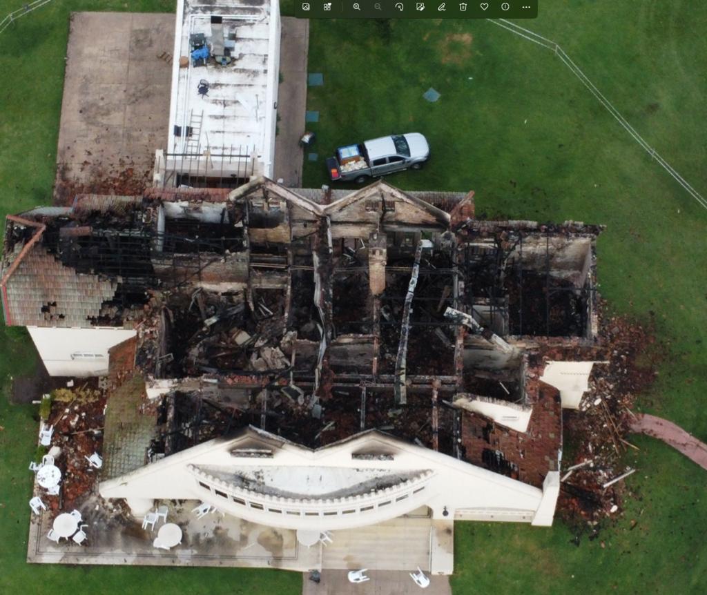La destrucción del Club House del Kentucky Country Club fue casi total. El fuego que se inició en la noche de este martes y se extendió durante algunas horas redujo a cenizas una parte importante de la obra construida en 1900.