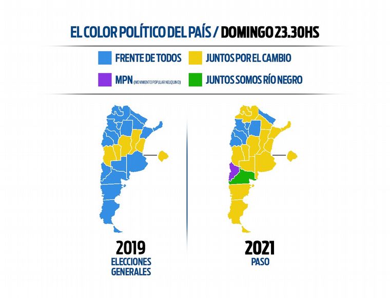 Una ola amarilla volvió a teñir la Argentina. Juntos se impuso con autoridad en casi todo el país: sus listas de diputados nacionales ganaron en 15 provincias. La oposición se impuso de norte a sur, de Jujuy a Tierra del Fuego. Una victorial electoral que incluye a los cinco distritos más poblados del país: Buenos Aires, Ciudad Autónoma de Buenos Aires, Córdoba, Santa Fe y Mendoza.