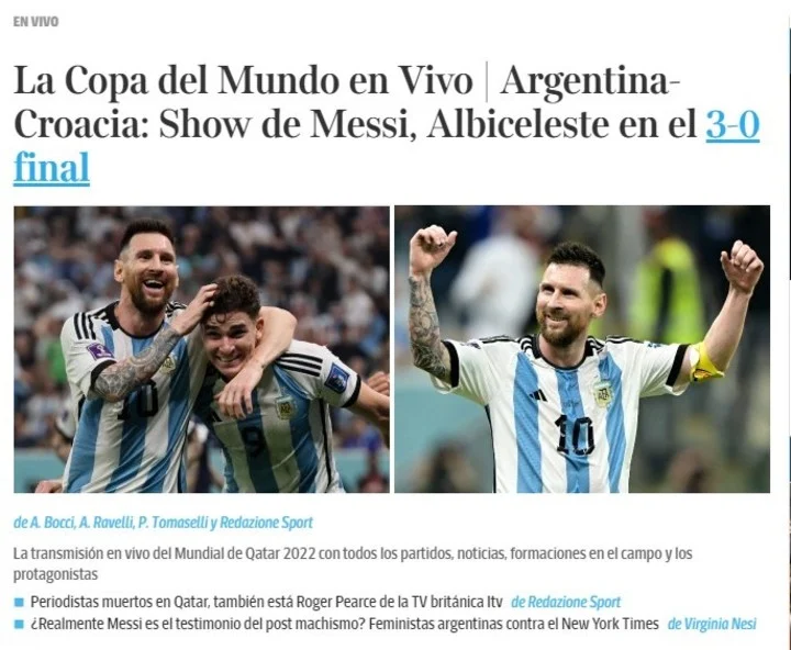Mientras que en Italia, el diario Corriere, informaron: “La Copa del Mundo en Vivo Argentina-Croacia: Show de Messi, Albiceleste en el 3-0 final”.