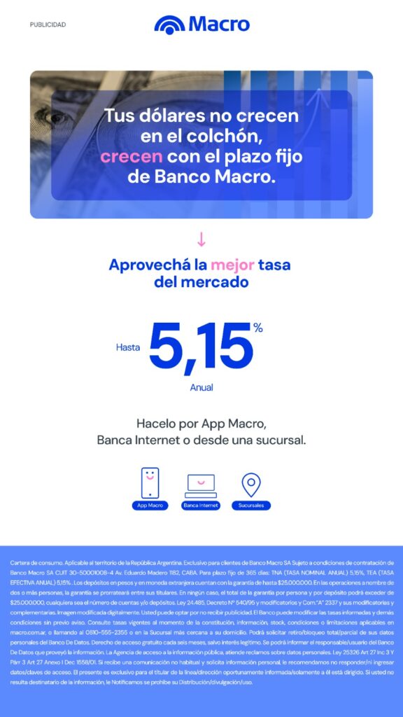 Banco Macro tiene la mejor tasa del mercado para plazo fijo en dólares: hasta 5,15% anual.