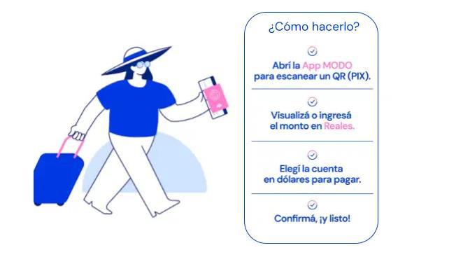 Para realizar el pago, los usuarios deben abrir la app MODO y escanear el código QR PIX del comercio, visualizar o ingresar el monto en reales, elegir la cuenta en dólares para pagar y confirmar la operación. Todo el proceso se realiza de forma inmediata, segura y desde el teléfono celular.