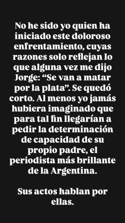 El pasado jueves, la abogada apuntó contra las hijas del periodista: “No he sido yo quien ha iniciado este doloroso enfrentamiento, cuyas razones solo reflejan lo que alguna vez me dijo Jorge: ‘Se van a matar por la plata’”.