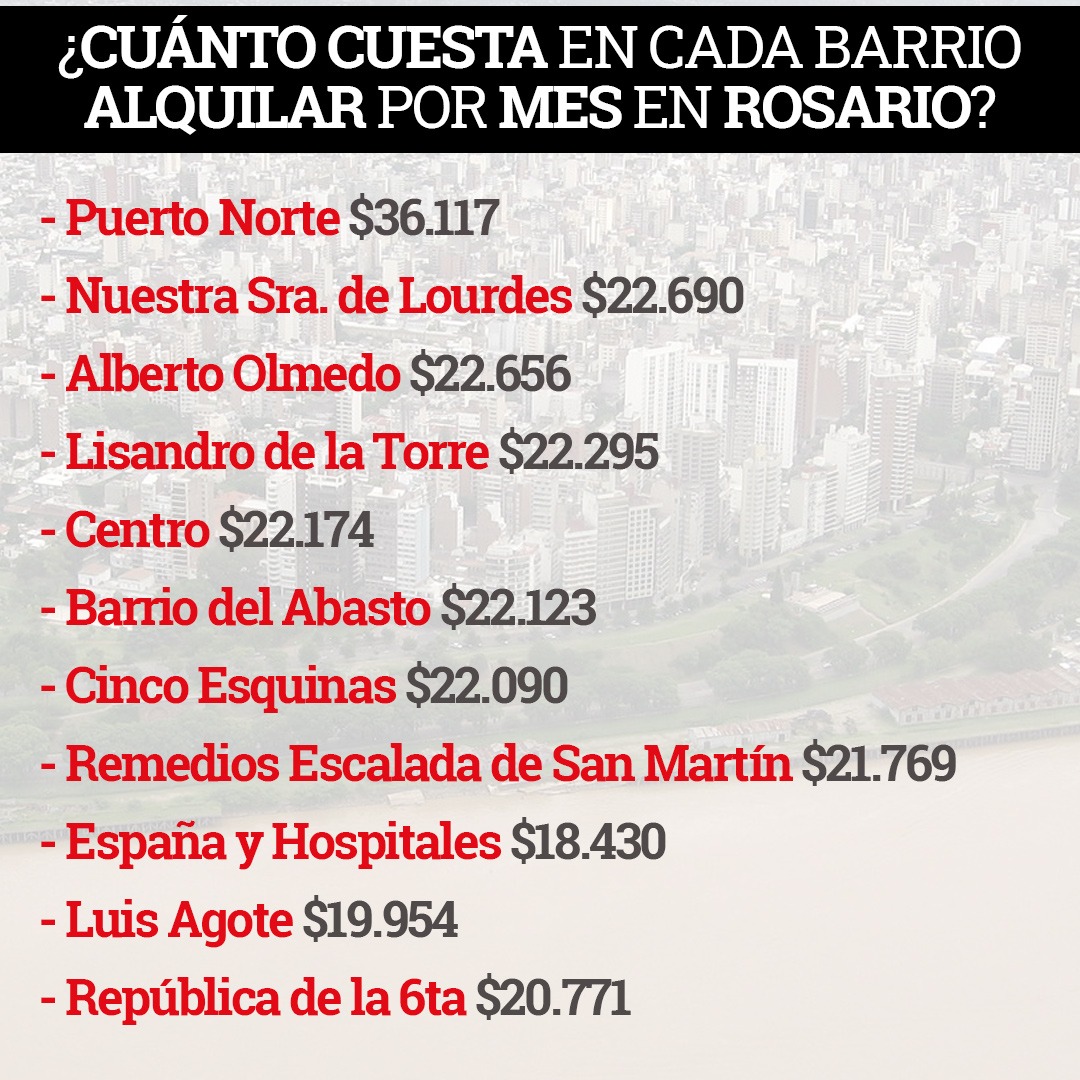 En Rosario, el portal de propiedades Zonaprop reveló que, el valor del alquiler de un dos ambientes y 50 metros cuadrados en la ciudad asciende a 22. 084 pesos por mes, mientras que una unidad de tres ambientes y 70 metros cuadrados 30.718 pesos mensuales.