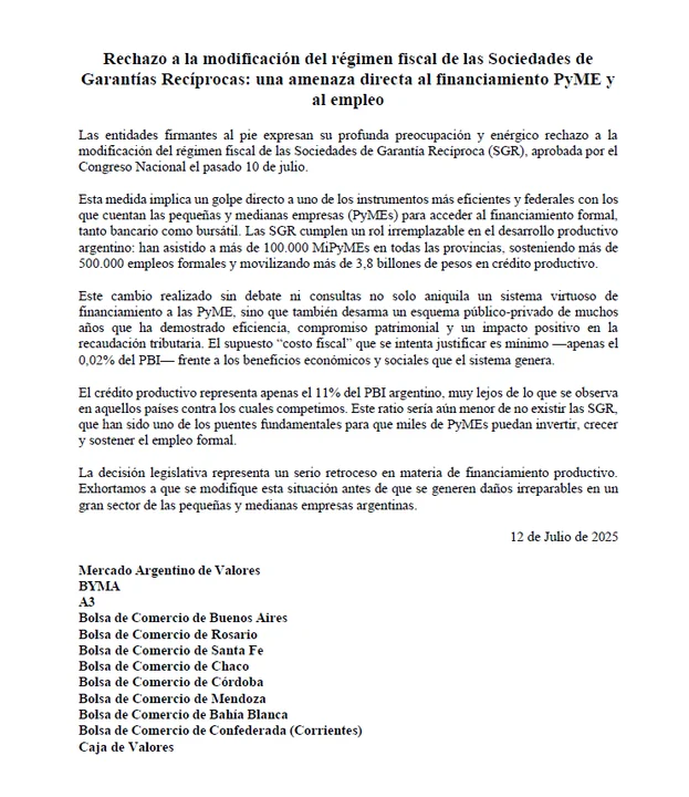 A través de un comunicado, difundido por el Mercado Argentino de Valores (MAVSA), distintas bolsas de comercio del país expresaron su rechazo frente al cambio en el régimen fiscal de las SGR, las entidades que se encargan de facilitar el acceso a créditos para las Pequeñas y Medianas Empresas (PyMEs).