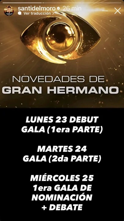 A través de sus redes sociales, Del Moro confirmó el cronograma oficial. “Novedades de Gran Hermano. Lunes 23 debut, Gala (1era parte)”, escribió junto a la imagen del icónico ojo dorado del programa.
