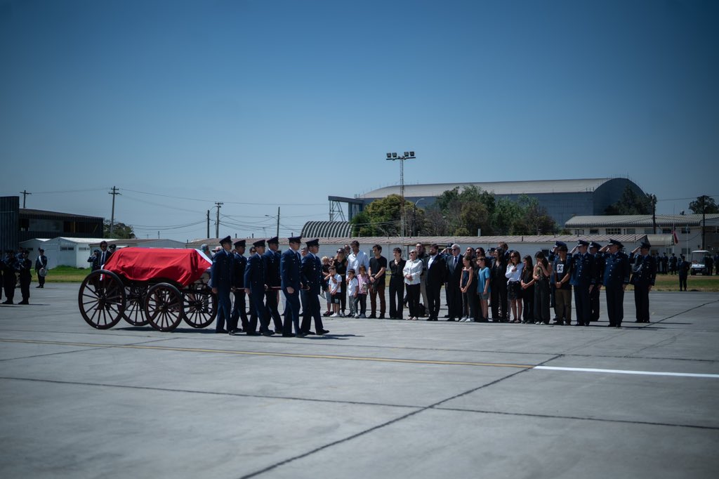 Personal de la FACh bajó el féretro, que tenía la bandera de Chile encima, en una ceremonia en la que se escucharon tonadas militares. Luego, Boric acompañó a Morel hasta el vehículo en el que fue colocado el féretro que transportará los restos de Piñera hasta el ex Congreso de Santiago, donde primero habrá una ceremonia íntima para la familia y por la tarde se habilitará un velatorio público.