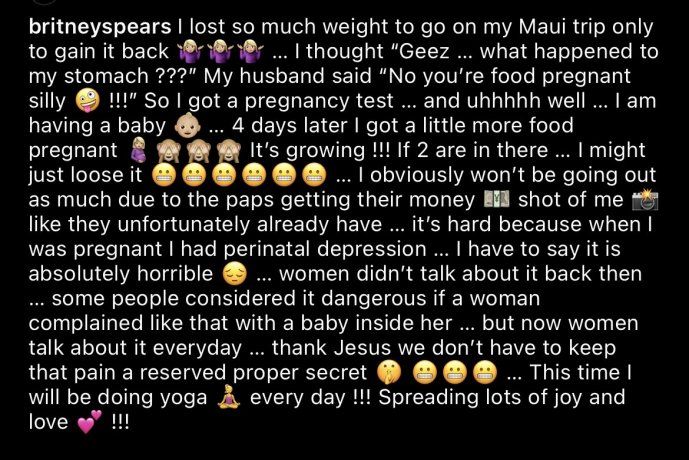 “Perdí mucho peso en mi viaje a Maui (ciudad en Hawái). Pensé: ‘Jesús, ¿qué le pasó a mi estómago?’ Entonces me hice un test de embarazo y bueno… ¡Tendré un bebé!”, indicó la princesa del pop en sus redes sociales. Y agregó: “Obviamente no estaré saliendo como lo hacía para que los paps no ganen dinero tomándome fotos”.