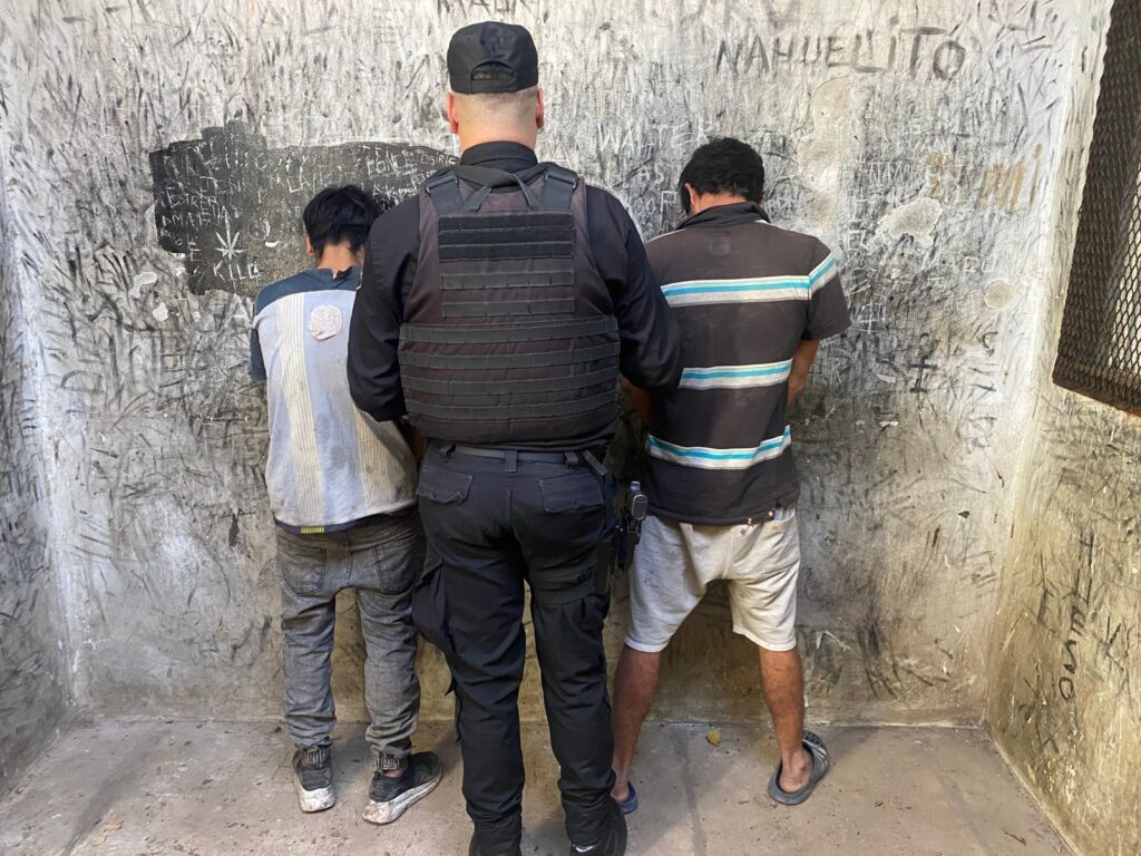 Horas después del hecho, personal del Comando Radioeléctrico que patrullaba por calle Richieri identificó a dos hombres con características coincidentes con las registradas en cámaras de seguridad. Al intentar detenerlos, los sospechosos huyeron hacia el monte, lo que derivó en una persecución.