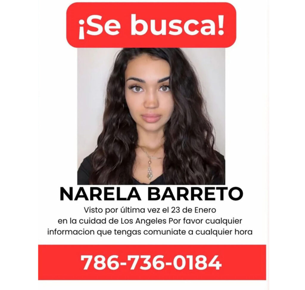 “¡Se busca! Narela Barreto. Vista por última vez el 23 de enero en la ciudad de Los Ángeles. Por favor, cualquier información que tengas, comunicate a cualquier hora al 786-736-0184”, señala uno de los flyers difundidos por la familia.