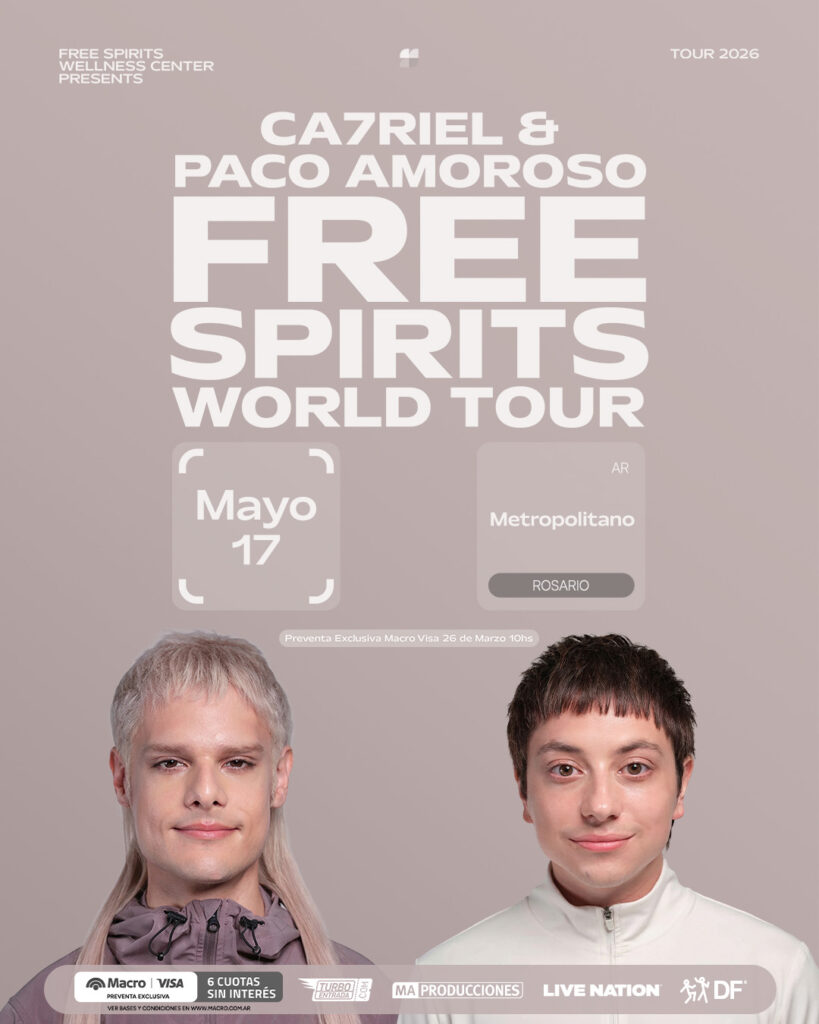 CA7RIEL & Paco Amoroso mantendrán el impulso del destacado PAPOTA Tour del año pasado, embarcándose en su gira mundial 2026 para celebrar el lanzamiento de FREE SPIRITS. Con inicio el 14 de mayo en el Movistar Arena de Buenos Aires, el tour recorrerá Latinoamérica, Norteamérica, el Reino Unido y Europa.