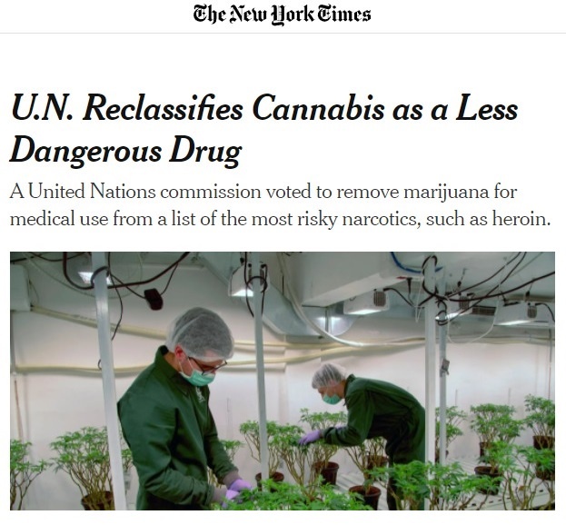 En 2019, la Organización Mundial de la Salud (OMS) recomendó que se elimine el cannabis (así como la resina de cannabis) del listado más restrictivo de la convención sobre drogas de 1961. Año en el que se elaboró la Lista Única Sobre Estupefacientes que incluyó a los narcóticos particularmente peligrosos para la salud humana que no tienen ninguna aplicación terapéutica, que sí tienen el cannabis y la resina de cannabis.