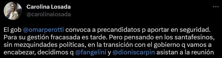 Ante tal pedido, Carolina Losada, actual senadora nacional por Santa Fe y precandidata a gobernadora de la provincia, respondió a un tweet que referenciaba la situación mostrando su disconformidad con la gestión del rafaelino, pero aceptando formar parte la reunión con la presencia de Federico Angelini, diputado nacional de Juntos por el cambio, y Dionisio Scarpin, senador nacional del mismo partido por Santa Fe del mismo partido.
