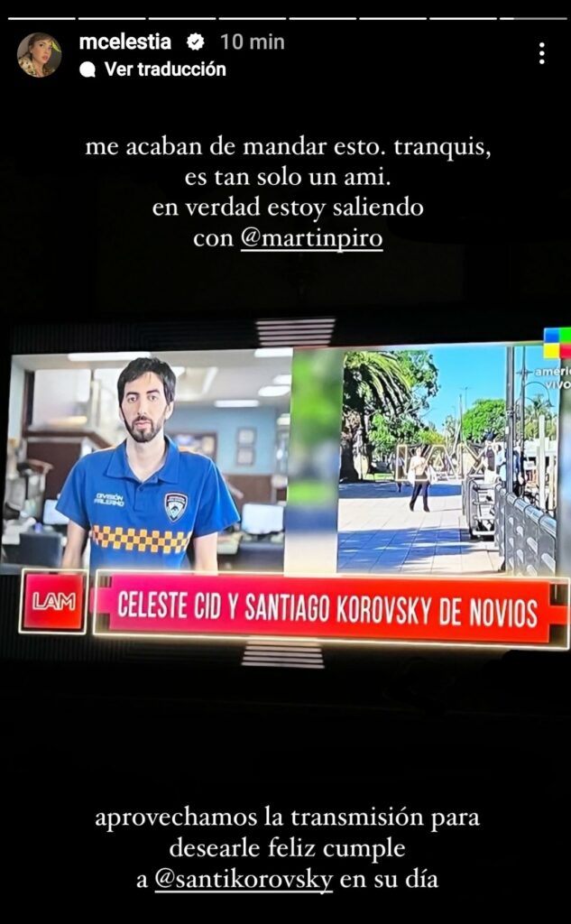 El día lunes la periodista Maite Peñoñori anunció que Celeste Cid estaría comenzando una relación amorosa con Santiago Korovsky, protagonista y director de la serie División Palermo. Sin embargo, la actriz salió a desmentir el romance en sus redes sociales.