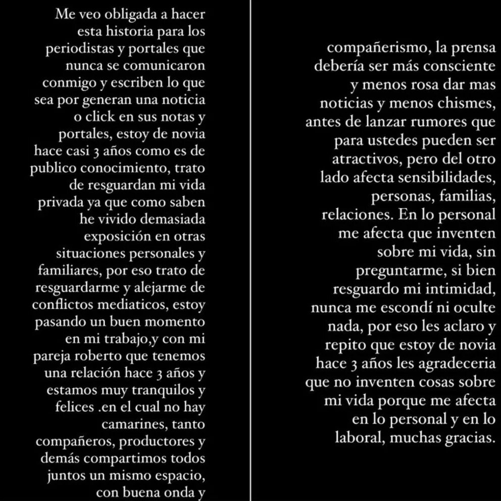 “En lo personal, me afecta que inventen sobre mi vida, sin preguntarme. Si bien resguardo mi intimidad, nunca me escondí ni oculté nada. Por eso les aclaro y repito que estoy de novia hace tres años. Les agradecería que no inventen cosas sobre mi vida porque me afecta en lo personal y en lo laboral. Muchas gracias”, cerró la modelo en sus historisa.