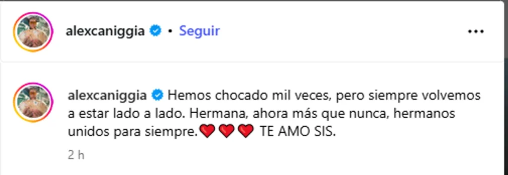 Alex también expresó su parte. Desde Instagram, compartió fotos del viaje y escribió: “Hemos chocado mil veces, pero siempre volvemos a estar lado a lado. Hermanos unidos para siempre. Te amo, sis”.