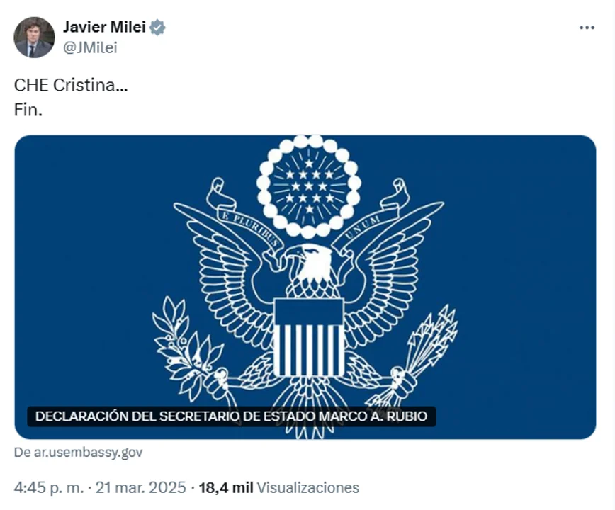 El presidente Javier Milei se hizo eco esta tarde de la sanción que Estados Unidos impuso contra la exmandataria Cristina Kirchner por “participación en corrupción significativa” y le dedicó en sus redes sociales un “Che, Cristina”.