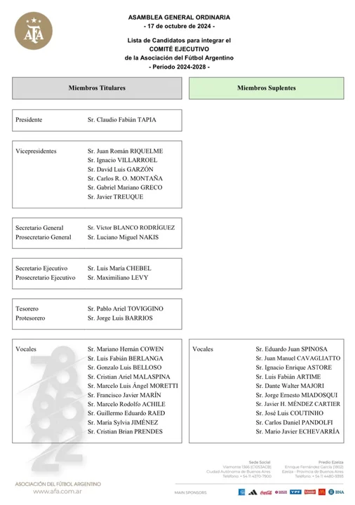El actual presidente de la Asociación del Fútbol Argentino, Claudio “Chiqui” Tapia, volvería a ser el presidente de la AFA ya que, hasta el día de hoy a las 18 horas, había tiempo de presentar una lista opositora y no se oficializó ninguna hasta el momento.
