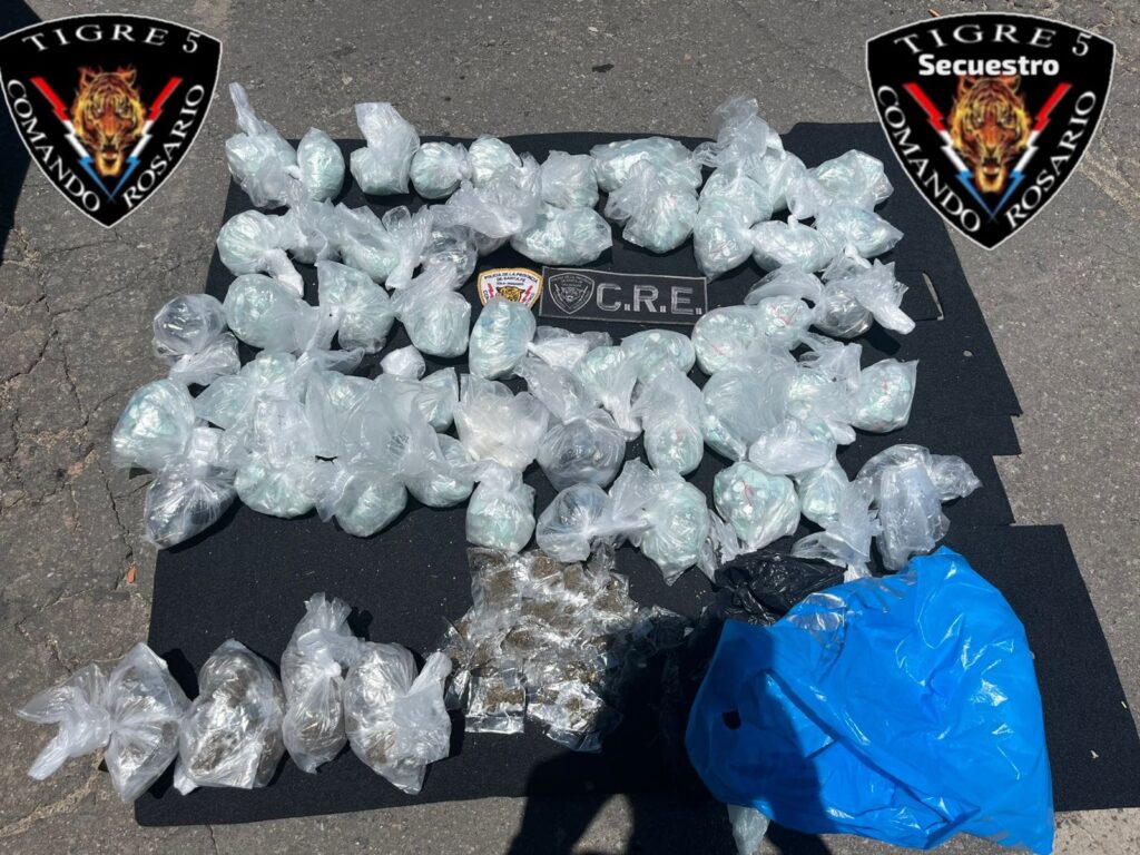 Durante el procedimiento, los policías observaron dos bolsas negras dentro del auto. Con la presencia de testigos, las revisaron y hallaron gran cantidad de envoltorios de nylon con un polvo blanco similar a clorhidrato de cocaína, fraccionado en dosis: según estimaciones iniciales, había más de dos mil. También encontraron material vegetal compatible con marihuana, distribuido en unas 250 dosis.