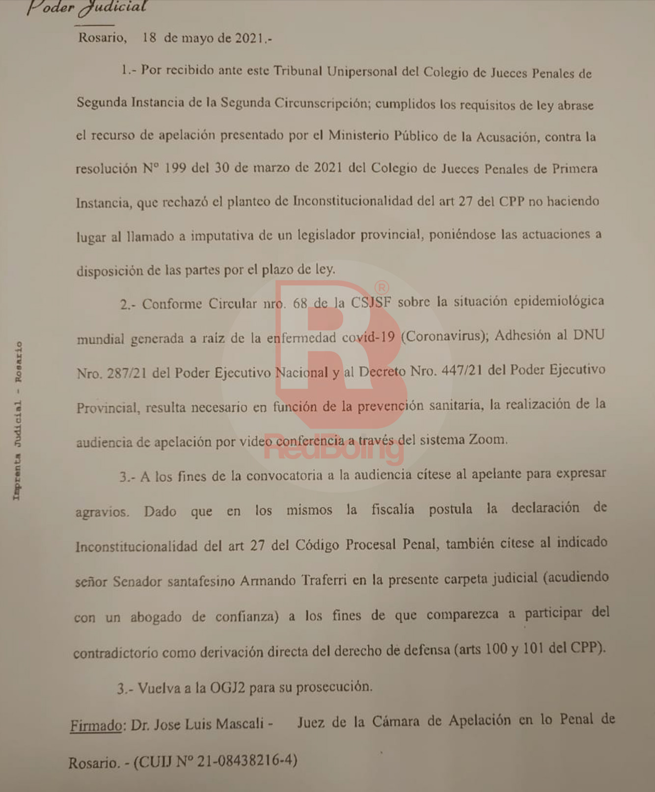 El Senador Armando Traferri será citado a audiencia en la Cámara Penal debido al planteo de inconstitucionalidad presentado por los fiscales Schiappa Pietra y Edery. En el inciso 3 de la resolución judicial indica que el Senador deberá presentarse junto a su abogado.