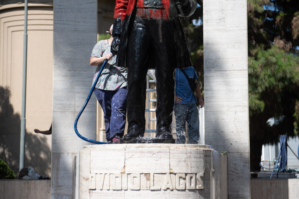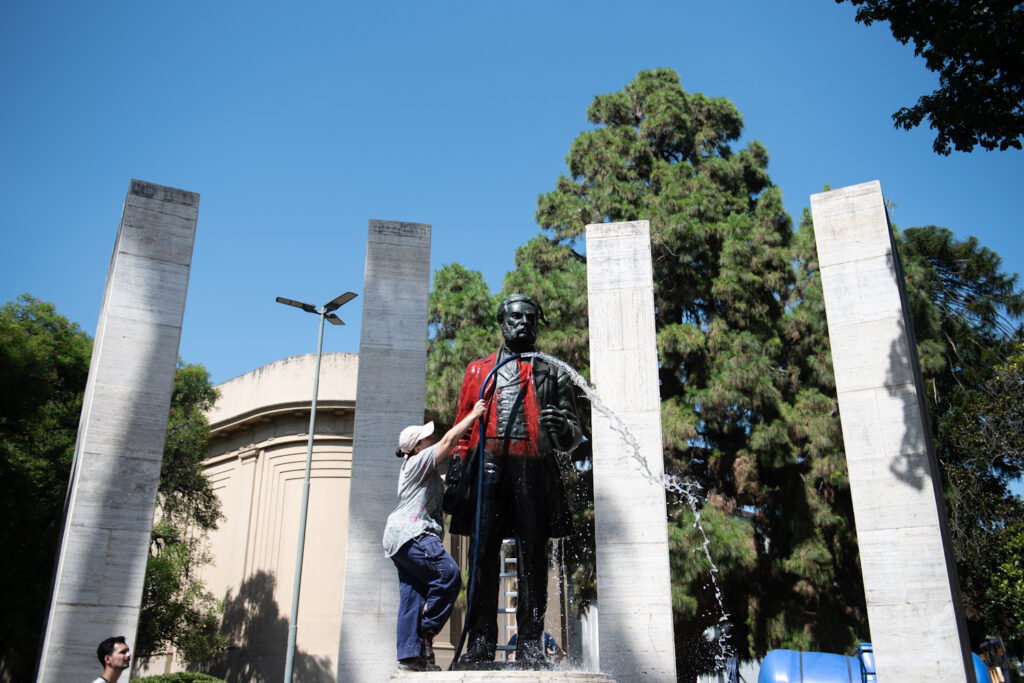 “Estamos haciendo, hicimos relevamiento de la pintura, por suerte es una pintura látex, fácil para sacarla, ahora estamos haciendo un trabajo de hidrolavado con jabón neutro y cepillo cerda blanda, para posterior usar otros productos para llegar a su óptima limpieza. Nosotros somos una dirección de restauración de la municipalidad de Rosario, eso se encargan los ejecutivos, nosotros somos empleados y nos dedicamos a la restauración de toda la estatuaria de la ciudad”, manifestó Cristian Vivas, director de Restauraciones de la municipalidad.