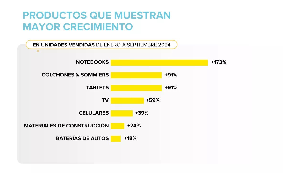 Mientras que en los primeros meses del año la categoría de supermercado y los productos de primera necesidad fueron los únicos que mostraron crecimiento interanual, a partir de mayo hubo un fuerte crecimiento de las categorías de productos no esenciales, siendo los productos de tecnología como notebooks (+173%), tablets (+91%) y televisores (+59%) los que lideraron el repunte en crecimiento de unidades vendidas versus 2023