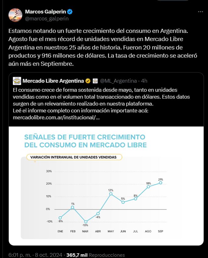 En agosto se alcanzó “el récord histórico de unidades vendidas en Mercado Libre, con 20 millones de productos equivalentes a 916 millones de dólares”.