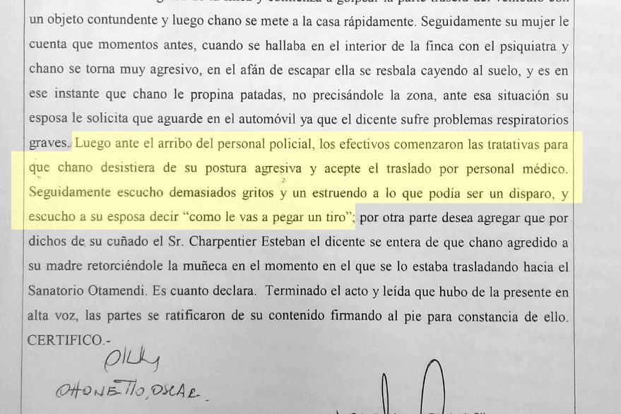 “Cómo le vas a pegar un tiro”, le dijo Marina Charpentier al policía Facundo Amendolara después que el uniformado le disparara a su hijo, Santiago Moreno Charpentier, más conocido como Chano, en el abdomen.