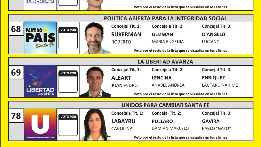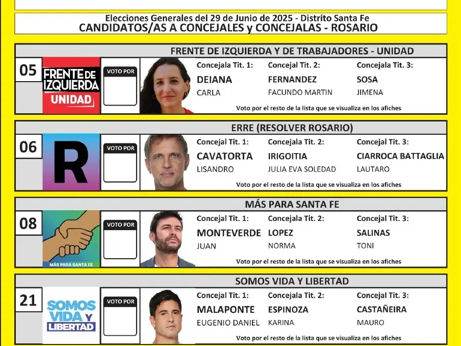 En la hoja de votación que se usará en Rosario, tras los resultados de las elecciones del 13 de abril para concejales, siete listas competirán por la renovación de trece bancas del Concejo Municipal.