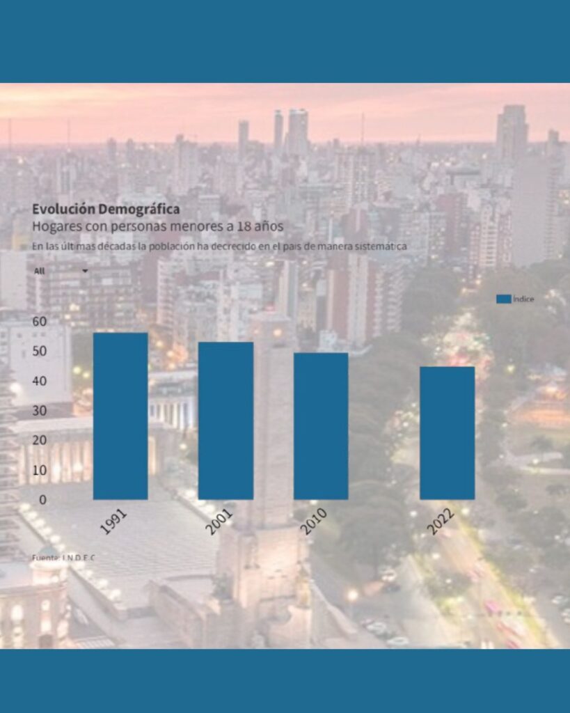 A esto se suma un cambio demográfico profundo: cada vez hay menos hogares con menores. Mientras en 1991 el 56% de los hogares tenía integrantes menores de 18 años, en 2022 ese valor descendió al 45% y para 2024 cayó al 43%. La tasa de natalidad, a su vez, se redujo a la mitad desde 2000, y las proyecciones marcan que para 2025 todas las jurisdicciones estarán por debajo del nivel de reemplazo poblacional.
