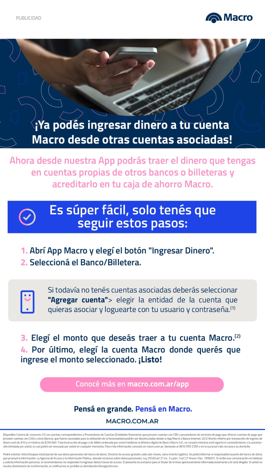 Desde hoy, los clientes de Banco Macro cuentan con la posibilidad de administrar todas sus cuentas desde una sola aplicación. Banco Macro incorpora en su App una funcionalidad que facilita el ingreso de dinero desde distintas aplicaciones a las cuentas personales del usuario. Así, quien tenga fondos en otros bancos o una fintech podrá ingresarlo a su cuenta de Banco Macro con un sólo “click” y manejar con practicidad sus finanzas personales.