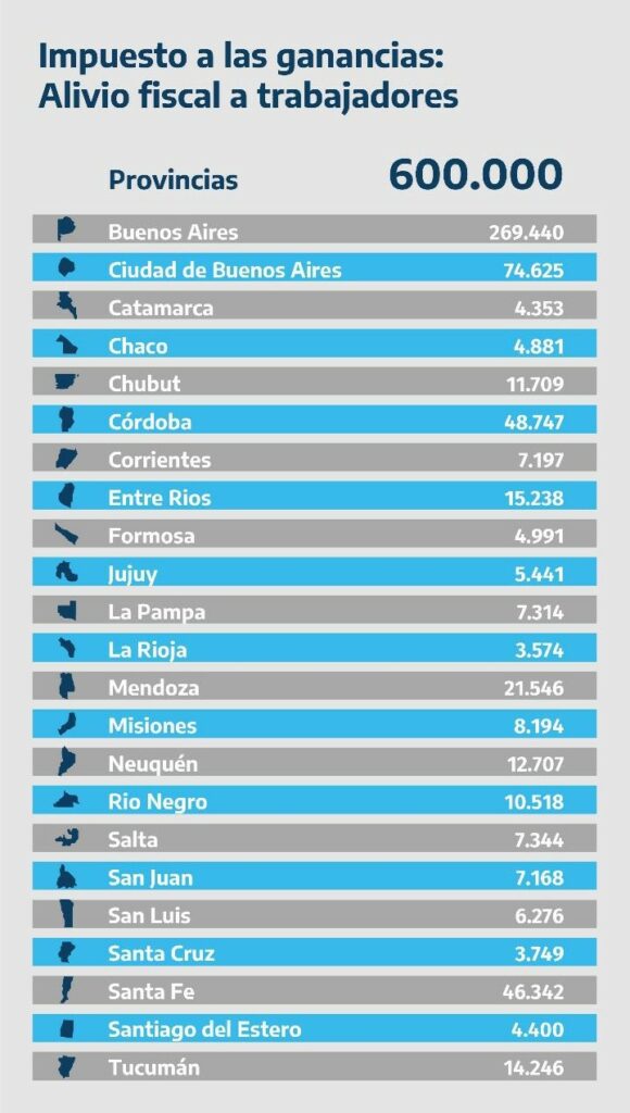 En tanto, la provincia con mayor cantidad de beneficiados por la suba en el piso del Impuesto a las Ganancias será Buenos Aires, con 269.440 contribuyentes. En segundo lugar estará la ciudad de Buenos Aires con 74.625.