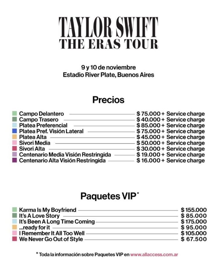 En el show habrá varios sectores por lo que los precios de las localidades van desde 16 mil pesos (con visión restringida) hasta 75mil pesos, siempre más cargo de servicio. Además, se ofrecen paquetes vip con lugares reservados en distintos sectores o “early tickets” y merchandising VIP exclusivo de la cantante.